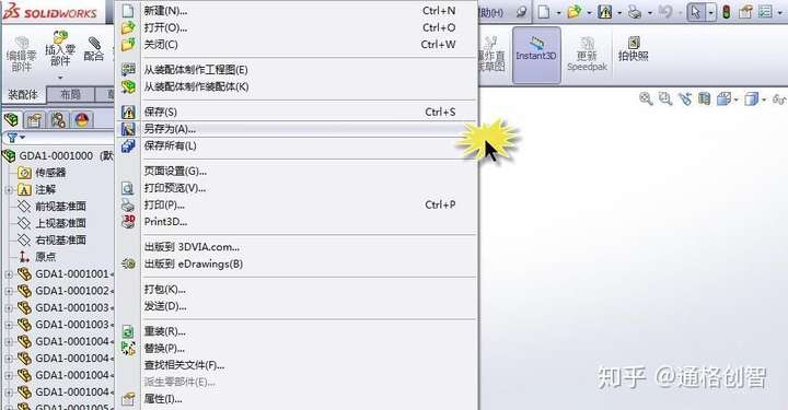 如下图所示,假设以GDA1为原型进行QPA2产品设计,需要对所有的GDA1更改为QPA2,由于SolidWorks零部件关联关系,不能直接修改零件名称,一个个的使用SolidWorks Explorer又很麻烦,在此可以通过另存为命令实现批量更名。