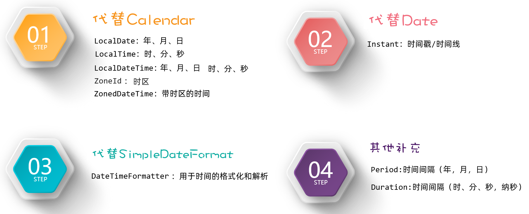 除以了上新增的类,JDK8还补充了两个类,一个叫Period类、一个叫Duration类;这两个类可以用来对计算两个时间点的时间间隔。