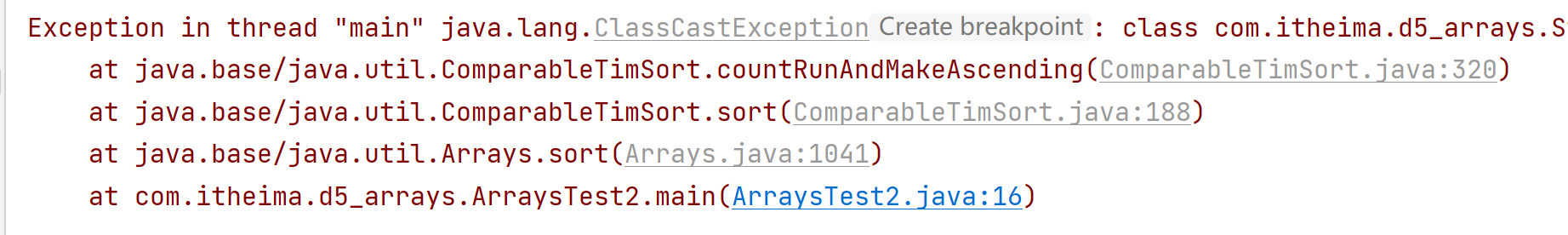 上面的代码为什么会报错呢?因为Arrays根本就不知道按照什么规则进行排序。为了让Arrays知道按照什么规则排序,我们有如下的两种办法。