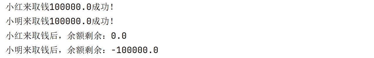 场景:小明和小红是一对夫妻,他们有一个共享账户,余额是10万元,小红和小明同时来取钱,并且2人各自都在取钱10万元,可能出现什么问题呢?