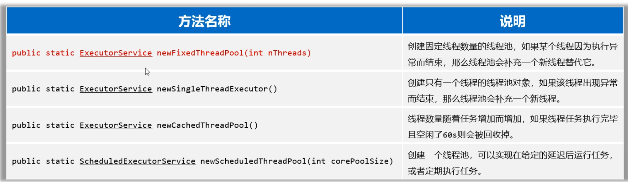 有同学可能会觉得前面创建线程池的代码参数太多、记不住,有没有快捷的创建线程池的方法呢?有的。Java为开发者提供了一个创建线程池的工具类,叫做Executors,它提供了方法可以创建各种不能特点的线程池。如下图所示