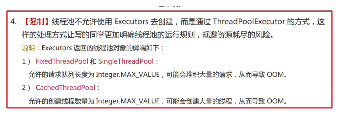 Executors创建线程池这么好用,为什么不推荐同学们使用呢?原因在这里:看下图,这是《阿里巴巴Java开发手册》提供的强制规范要求。