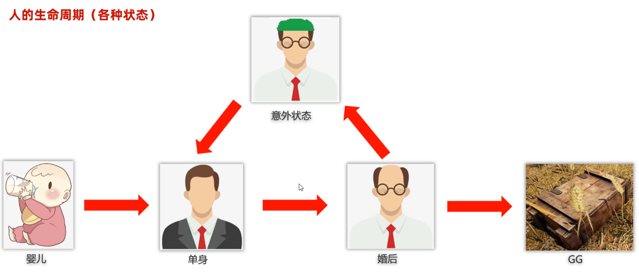 为了让大家同好的理解线程的生命周期,先用人的生命周期举个例子,人从生到死有下面的几个过程。在人的生命周期过程中,各种状态之间可能会有切换,线程也是一样的。