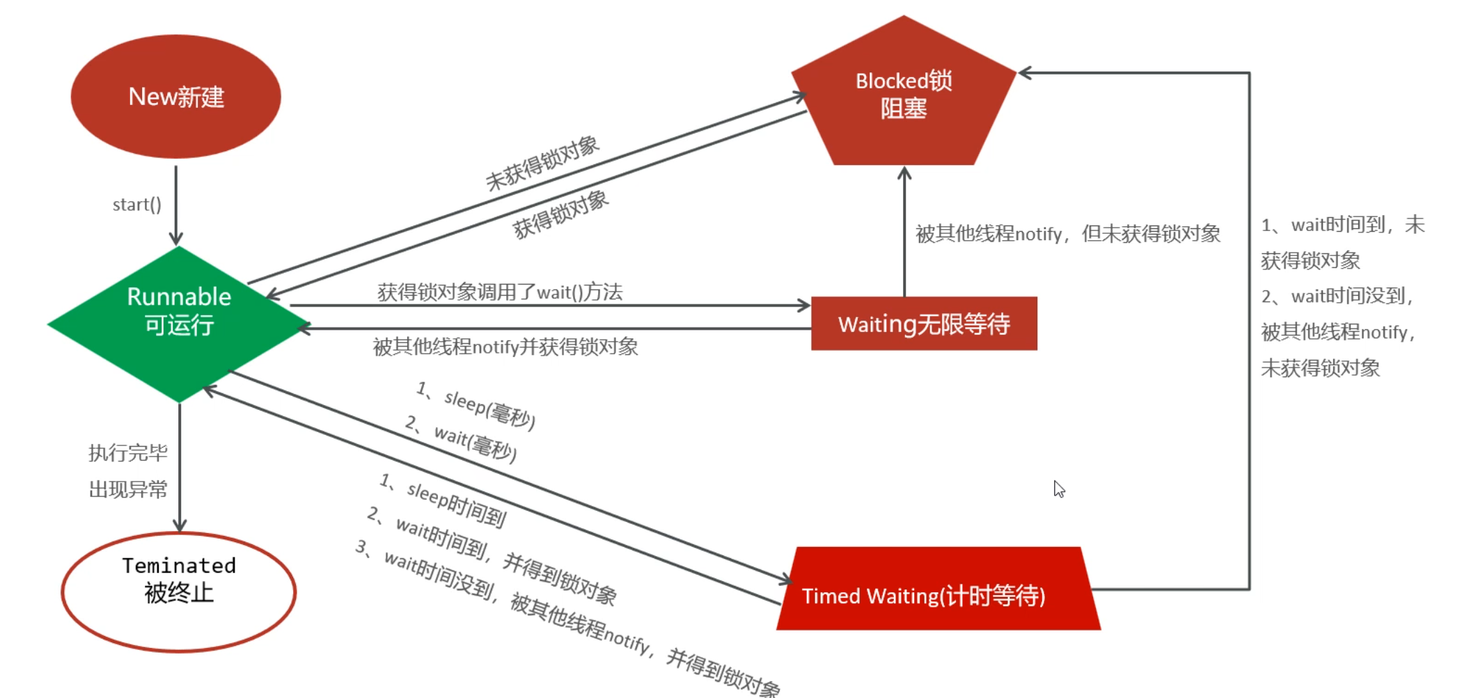TERMINATED: 终止状态, 线程执行完毕或者遇到异常时,处于这个状态。