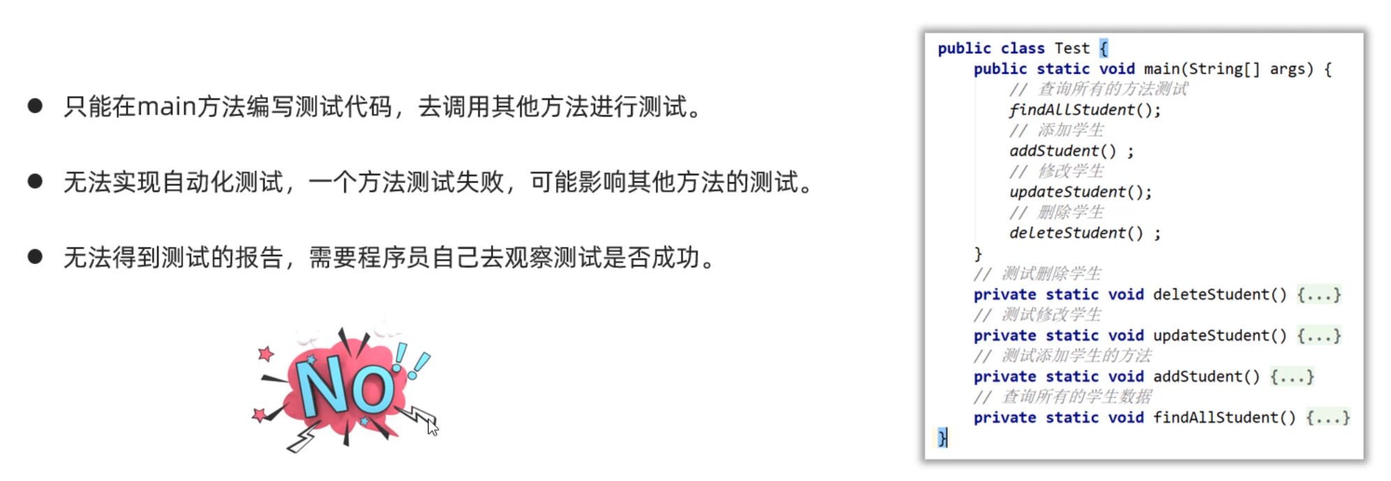 但是在main方法中写测试代码有如下的几个问题,如下图所示: