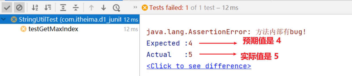 运行测试方法,结果如下图所示,表示我们预期值与实际值不一致