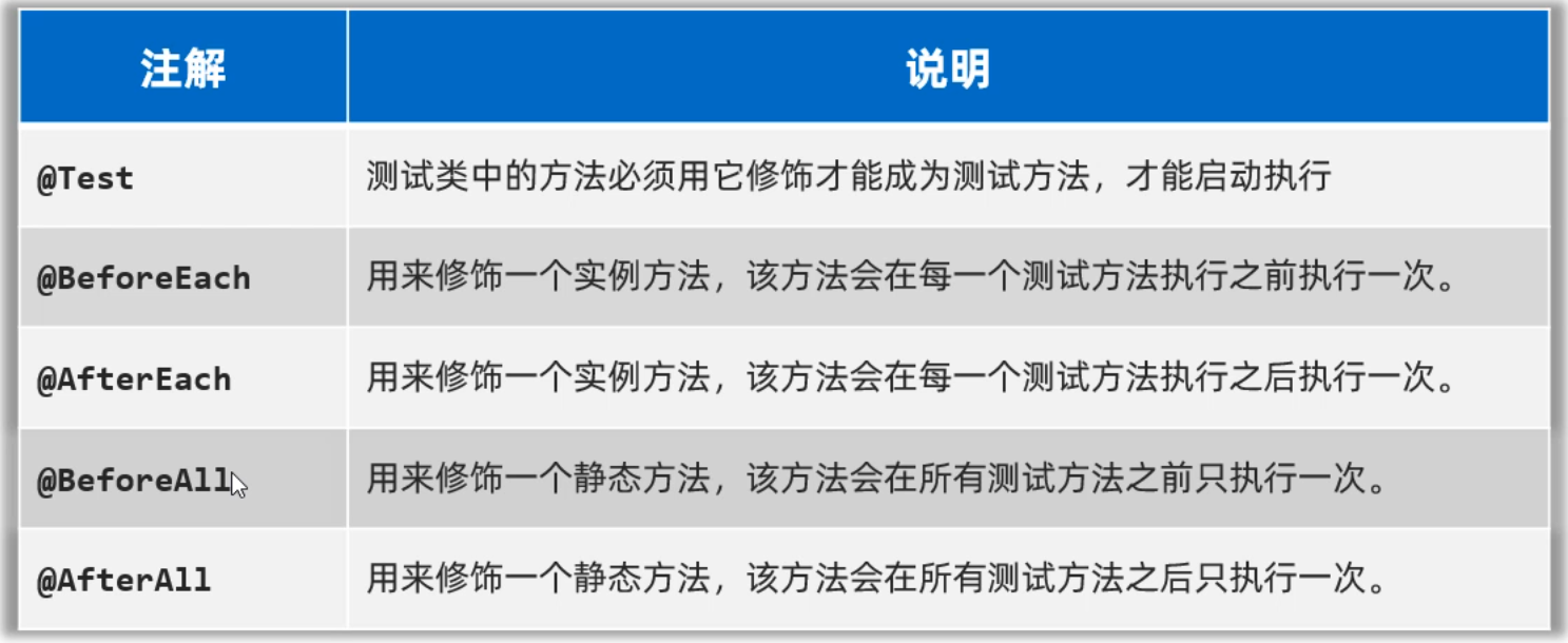 最后,我们再补充一点。前面的注解是基于Junit4版本的,再Junit5版本中对注解作了更新,但是作用是一样的。所以这里就不做演示了