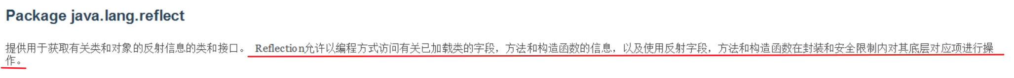 接下来,我们就需要带着同学们认识一下什么是反射。其实API文档中对反射有详细的说明,我们去了解一下。在java.lang.reflect包中对反射的解释如下图所示