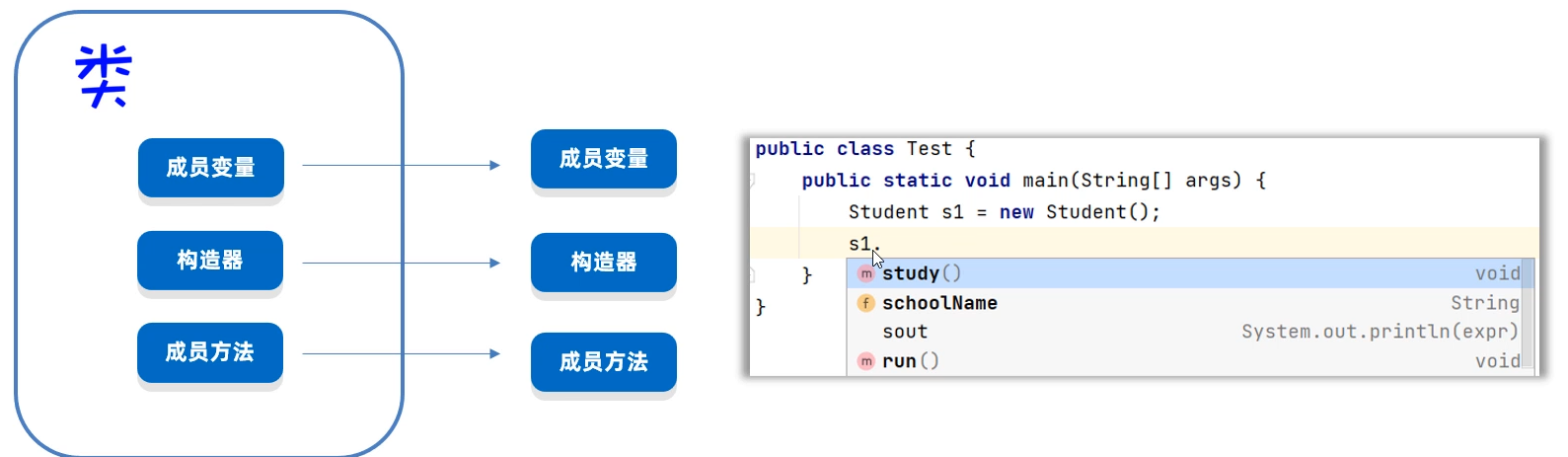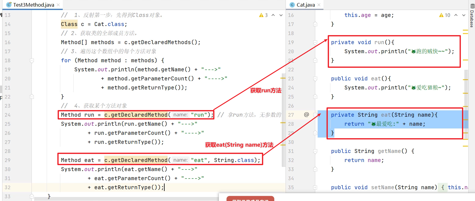 问题是IDEA怎么知道这个对象有这些方法可以调用呢? 原因是对象能调用的方法全都来自于类,IDEA通过反射技术就可以获取到类中有哪些方法,并且把方法的名称以提示框的形式显示出来,所以你能看到这些提示了。