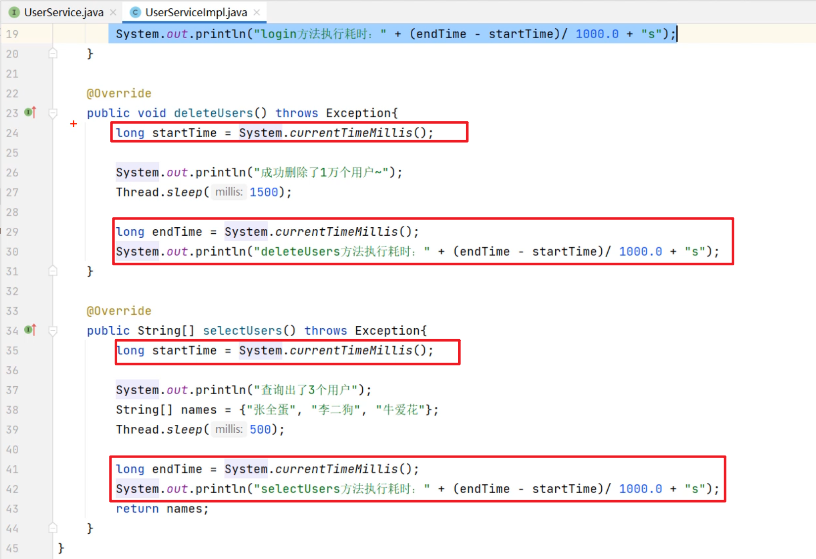 下面有一个UserService接口的实现类,下面每一个方法中都有计算方法运行时间的代码。