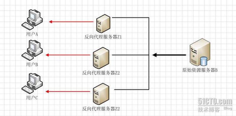 当反向代理服务器不止一个的时候,我们甚至可以把它们做成集群,当更多的用户访问资源服务器B的时候,让不同的代理服务器Z(x)去应答不同的用户,然后发送不同用户需要的资源。