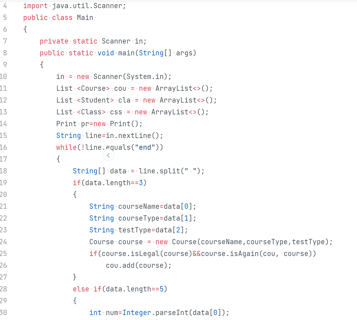 +--------------+ | CourseGrade | +--------------+ | - course_name| | - course_property| | - assessment_method| | - score_items| | - students| +--------------+ | | +----------------------+ | | +--------------+ +------------------+ | ExamGrade | | ExperimentGrade | +--------------+ +------------------+ | | | | | - weight | | - weight | | - students | | - students | +--------------+ +------------------+ | | | | +-------------------+ +---------------------+ | | | | +----------------+ +------------------+ +---------------------+ | StudentGrade | | ScoreItem | | ScoreItem | +----------------+ +------------------+ +---------------------+ | - student_id | | - score_value | | - score_value | | - student_name | | - weight | | - weight | | - course_name | +------------------+ +---------------------+ | - score_items | +----------------+ 根据题目描述和源码,我们可以将系统的类划分为以下几个核心类: