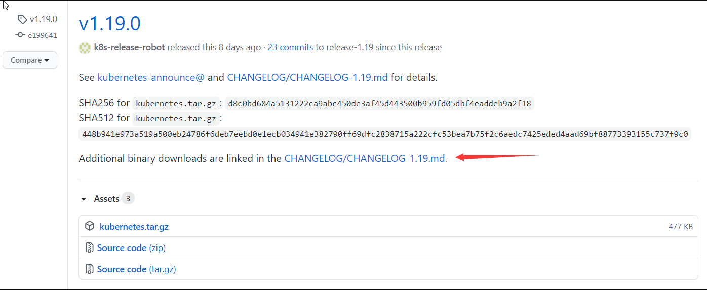 我这里下载的是1.19.0版本,注意下载链接是在CHANGELOG/CHANGELOG-1.19.md里面: