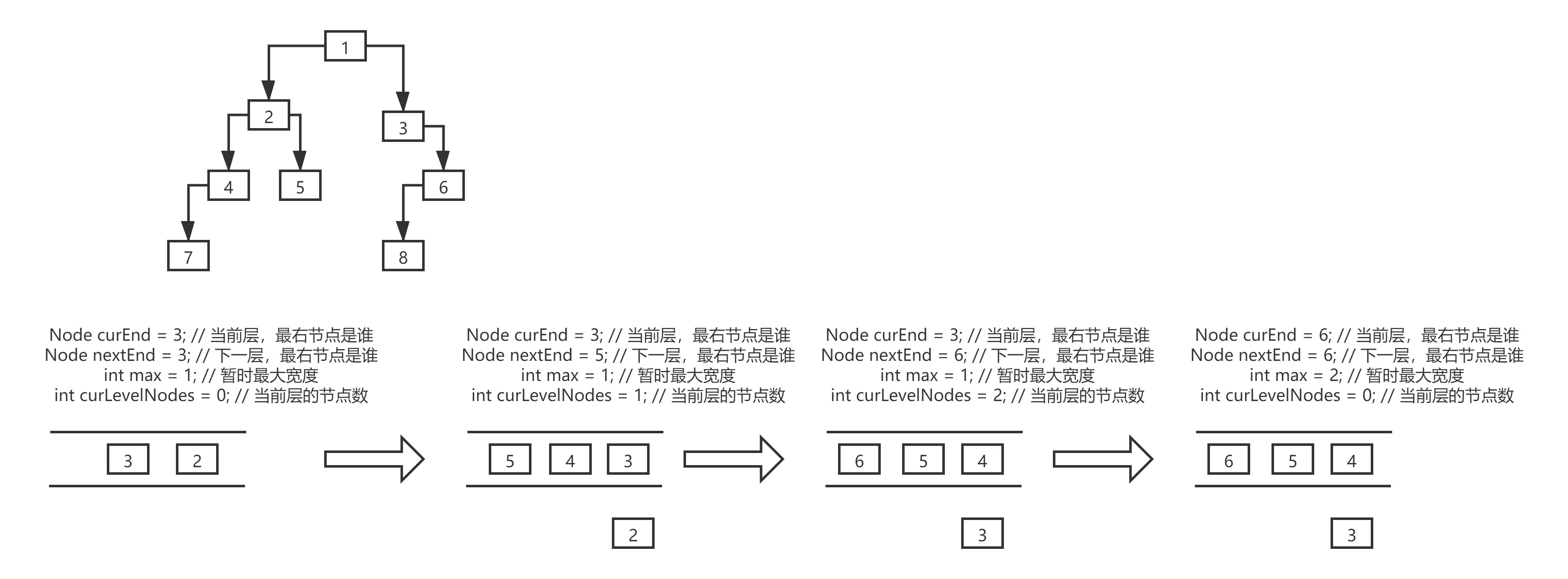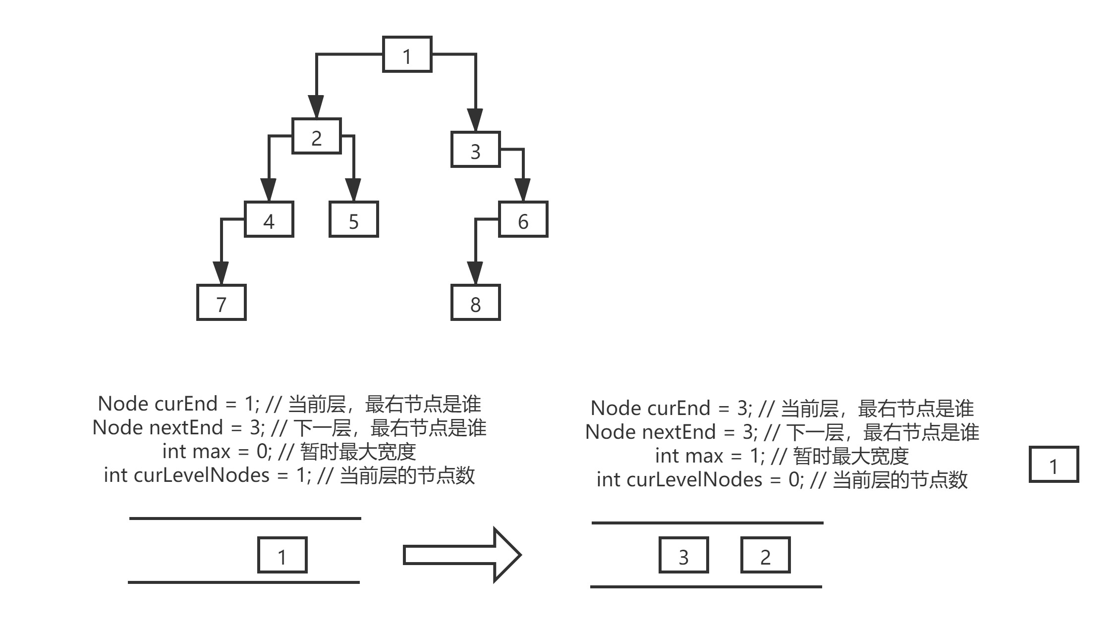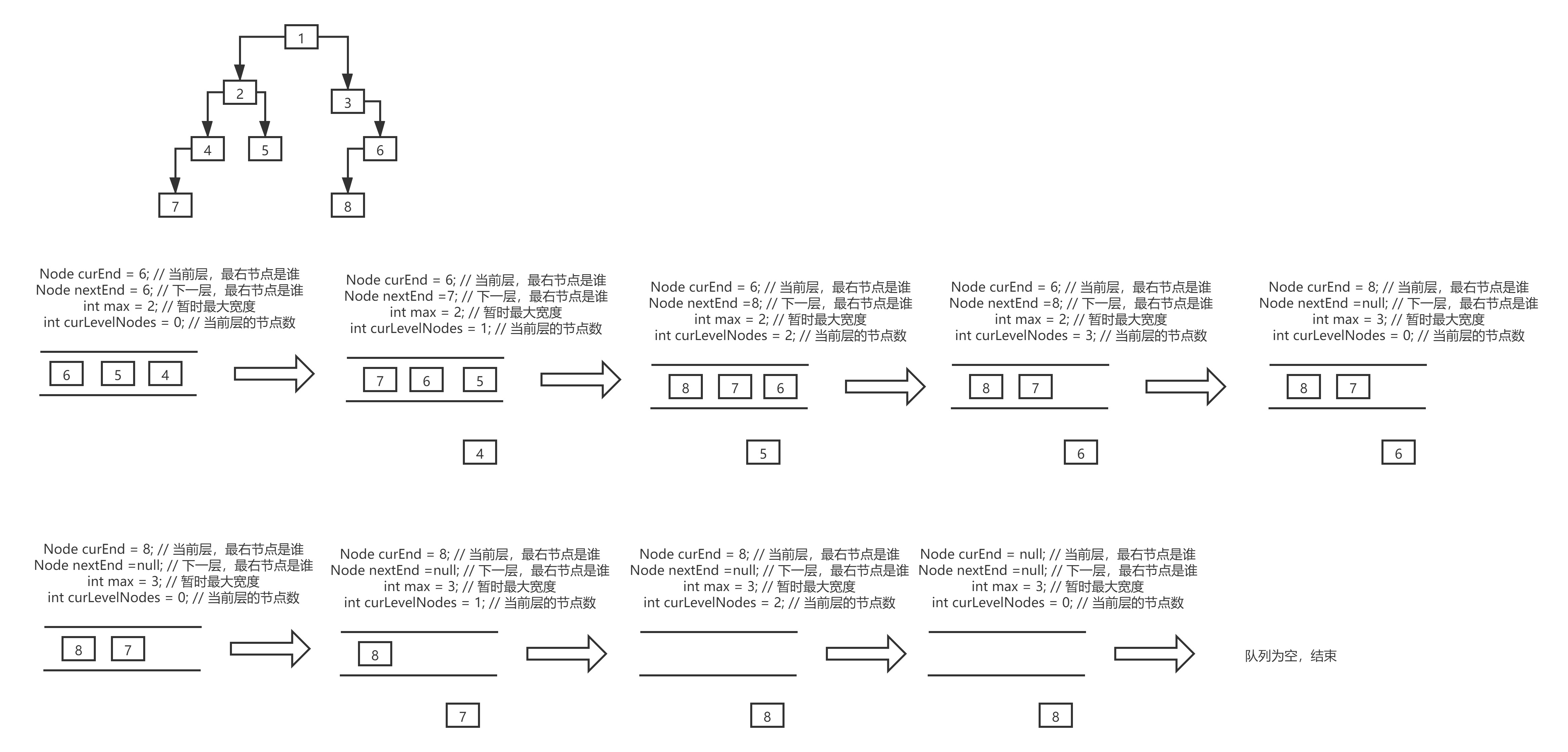 头结点出队,curLevelNodes ++,此时 出队节点==curEnd, max = 当前curLevelNodes ,curLevelNodes 重新=0,curEnd = nextEnd ,nextEnd = null ;