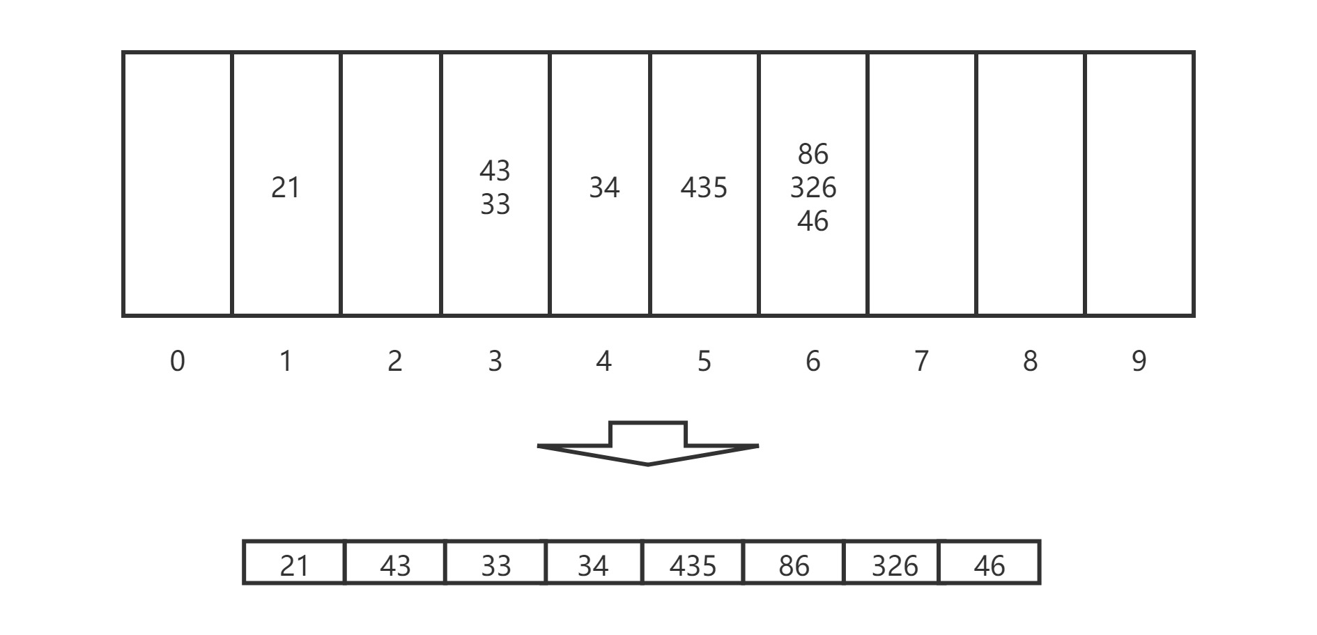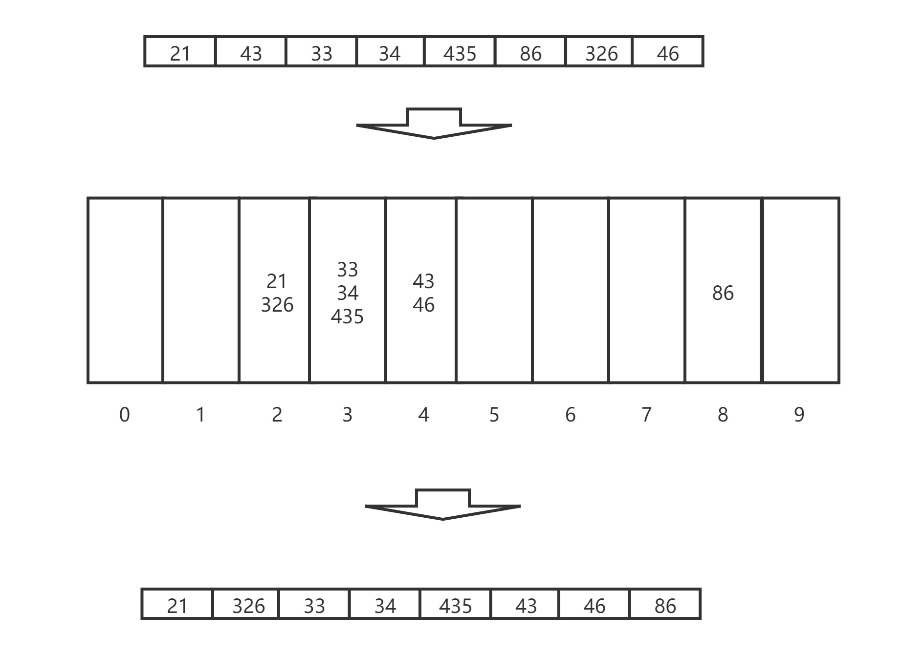 这个数组从左到右遍历数组,每个元素的十位数是多少,就进入几号桶中,在遍历桶依次排列元素,按十位数从小到大排好序的数组;