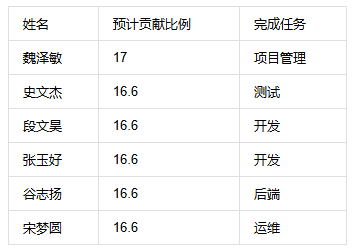 队员根据意向进行基础分工,项目管理会根据队员的基础分工发布基础任务,同时将在队内发布额外任务,并且根据任务的耗时、期限、难度给予一定的分值,由队员来领取自己心仪的任务,对于无人接取的任务,将会加大分数比重,最后统计个人贡献分时将会进行计算每个人的分数和总分数的比例,并且综合考虑队员在队内的活跃程度。