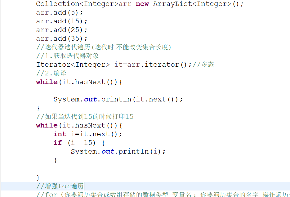 Collection集合元素的通用获取方式:在取元素之前先要判断集合中有没有元素,如果有,就把这个元素取出来,继续在判断,如果还有就再取出出来
