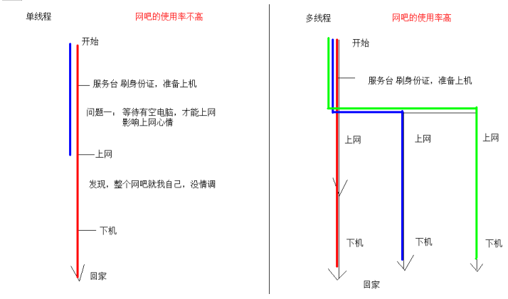 l 单线程程序:即,若有多个任务只能依次执行。当上一个任务执行结束后,下一个任务开始执行。如,去网吧上网,网吧只能让一个人上网,当这个人下机后,下一个人才能上网。