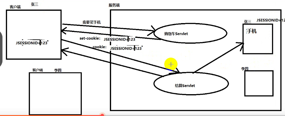 张三表示要买手机,发出请求,然后我们在服务器端开一个内存给张三 并且生成jsessionid号为123(唯一的),然后把手机存进去,然后服务器把这个内存的