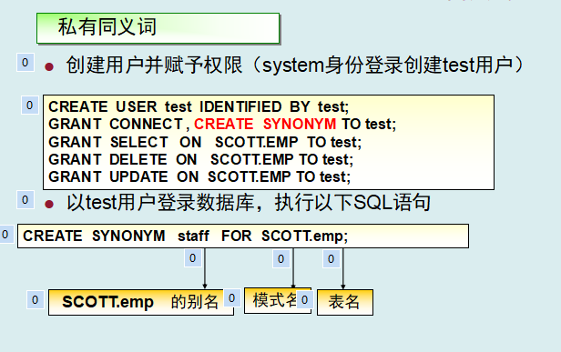 --创建私有 谁创建谁用同义词 create synonym mytable for scott.emp