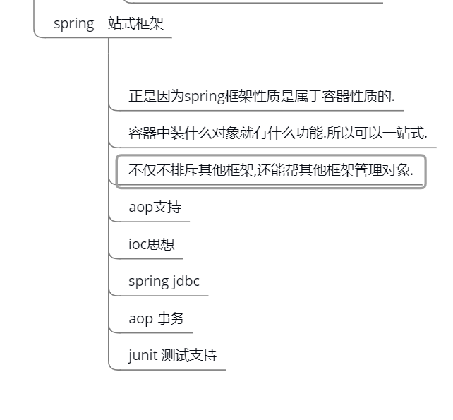 spring一站式框架,正是因为spring框架性质是属于容器性质的.容器中装什么对象就有什么功能.所以可以一站式.不仅不排斥其他框架,还能帮其他框架管理对象.