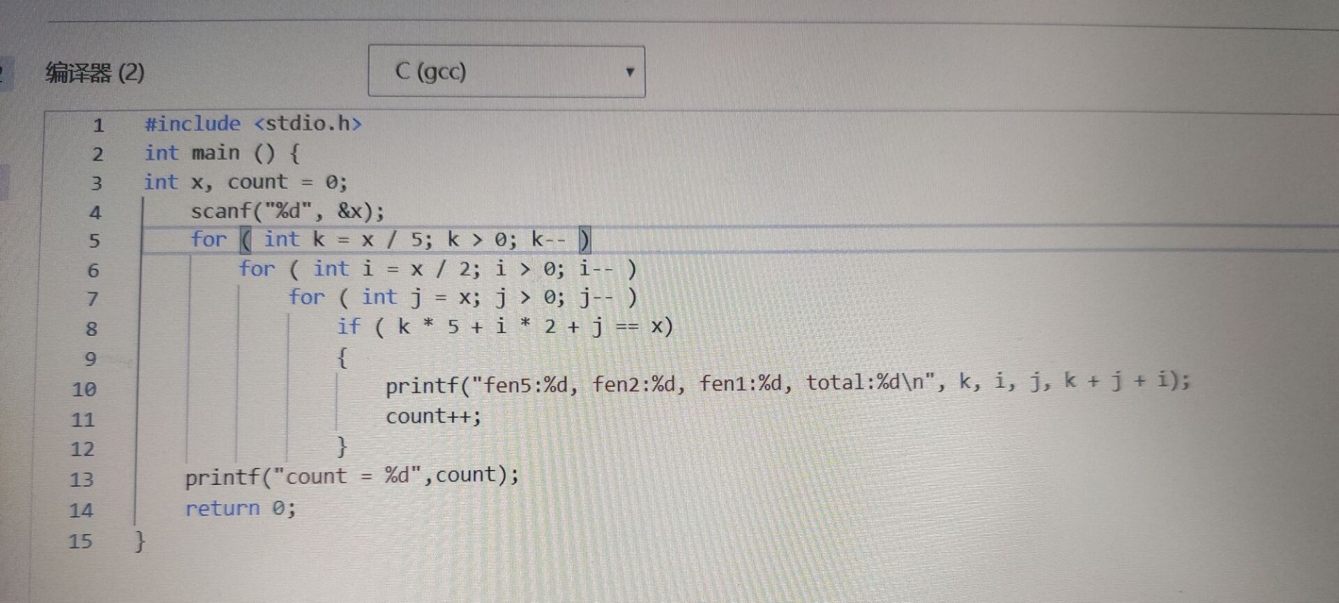 要求按5分、2分和1分硬币的数量依次从大到小的顺序,输出各种换法。每行输出一种换法,格式为:“fen5:5分硬币数量, fen2:2分硬币数量, fen1:1分硬币数量, total:硬币总数量”。最后一行输出“count = 换法个数”。