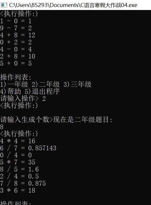 设计思路:刚开始也不知道怎么去给一个随机计算赋予答案,后来百度查询了一下才知道该怎么去做,要用到新的输出格式类型%g来输出赋予的答案。
