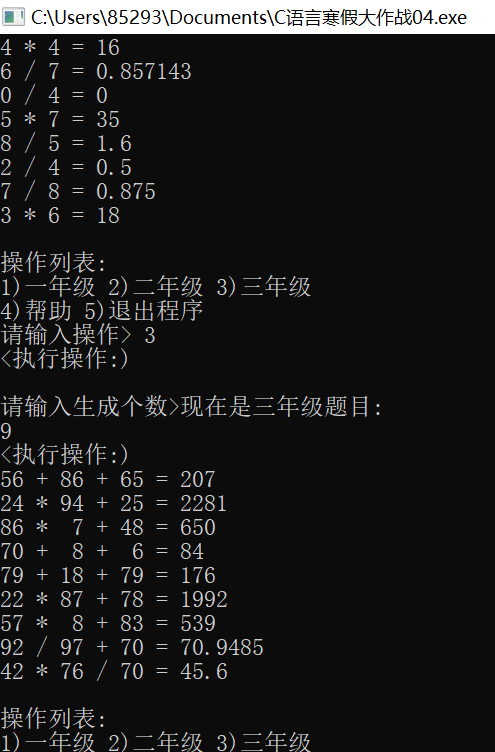 printf("三年级题目为不超过百位的加减乘除混合题目.\n");