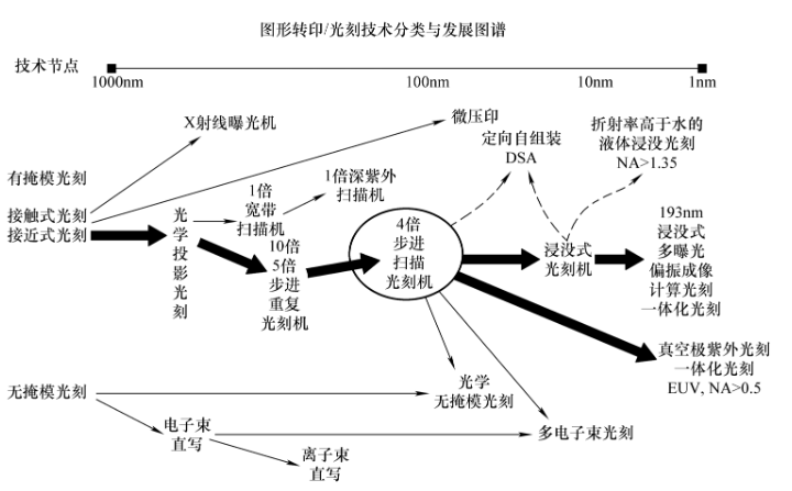 光刻技术经历了接触/接近式光刻、光学投影光刻、步进重复光刻、扫描光刻、浸没式光刻、EUV光刻的发展历程。