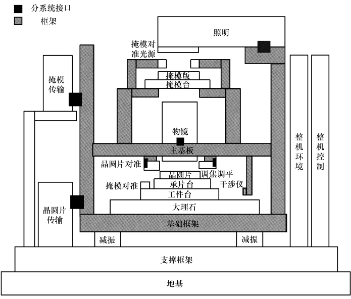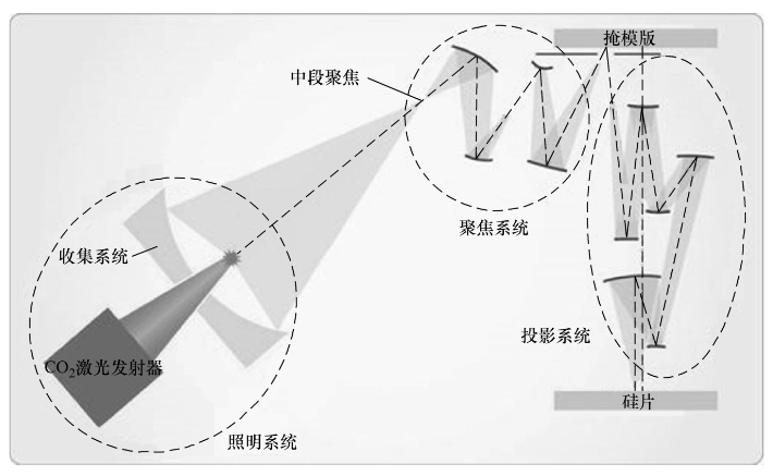 EUV光刻机主要由光源、照明、物镜、工件台、掩模台、晶圆片对准、调焦/调平、掩模传输、晶圆片传输、真空框架等分系统组成。极紫外光经过多层镀膜的反射镜组成的照明系统后,照射在反射掩模上,被掩模反射的光进入由一系列反射镜构成的光学全反射成像系统,并最终在真空环境下将掩模的反射像投影在晶圆片表面。EUV光刻机的曝光视场和成像视场均为弧形,并采用步进扫描方式实现全晶圆片曝光,以提高产出率。ASML公司的最先进的NXE系列EUV光刻机采用波长为13.5nm的曝光光源、反射型掩模(6 °角斜入射)、6镜结构的4倍缩小反射投影物镜系统(NA=0.33)、扫描视场为26mm × 33mm、真空曝光环境。
