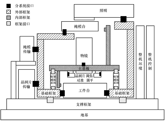 首先,利用晶圆片传输分系统将涂覆好光刻胶的晶圆片传输到工件台上,同时利用掩模传输分系统将需要曝光的掩模传输到掩模台上;