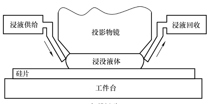 由瑞利公式可知,在曝光波长不变的情况下,进一步提高成像分辨率的有效方法是增大成像系统的数值孔径。对于45nm以下及更高的成像分辨率,采用ArF干法曝光方式已经无法满足要求(因其最大支持65nm成像分辨率),故而需要引入浸没式光刻方法。传统的光刻技术中,其镜头与光刻胶之间的介质是空气,而浸没式光刻技术是将空气介质换成液体(通常是折射率为1.44的超纯水)。实际上,浸没式光刻技术利用光通过液体介质后光源波长缩短来提高分辨率,其缩短的倍率即为液体介质的折射率。虽然浸没式光刻机是步进扫描光刻机中的一种,其设备整机系统方案也没有变化,但由于引入了与浸没相关的关键技术,所以它属于ArF步进扫描光刻机的改型与拓展。