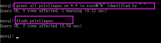 mysql> grant all privileges on *.* to root@"%" identified by ".";