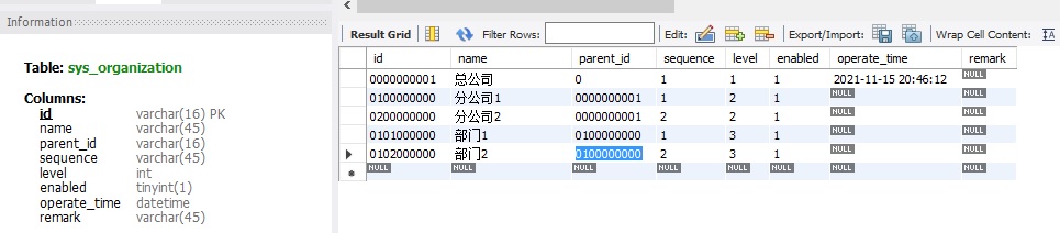 1、部门的数据表中必须有“部门编号”和“父级部门编号”这两个字段,其余字段根据自己需要添加,如下图所示。parent_id就是父级部门编号。