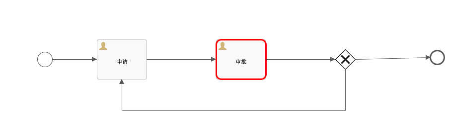 一、首先要准备bpmn20流程图文件,网上有许多教程,通过eclipse或IDEA里安装插件后绘制bpmn20流程图文件,但是尝试后都不成功,绘制出来的图不适用于activiti。我的做法是去github下载老版本的activiti 6的本地运行包,放入tomcat 8服务器中运行(只能用tomcat 8和JDK 8,不能用tomcat 9或更高版本的JDK),然后在网页上绘制bpmn20流程图,这里示例绘制的图形如下。最左边的圆圈是起始点,中间两个方框是流程任务,带叉叉的小方框是排他网关,最后一个粗线圆圈是终点。流程的过程是发起者提交申请,由审批者审批,如果审批通过,则此次流程结束,如果审批未通过,则返回申请者处理后再重新审批……