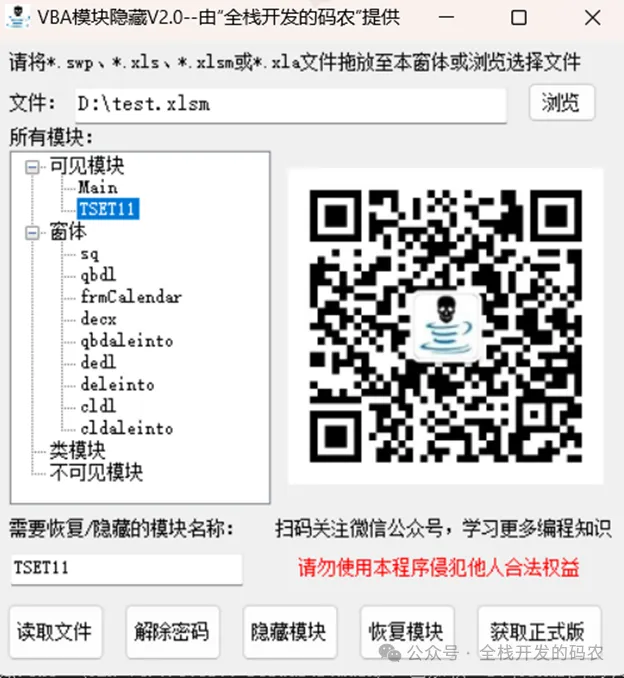 自从上次发布了第1版“一键隐藏和恢复VBA代码模块”的程序后,许多粉丝朋友都大力支持,在此表示感谢。也正是因为你们的支持使我有更大的动力不断更新和完善程序,经过努力,现在发布第2版。在使用第1版的过程中,最受诟病的是程序不支持新版的xlsm格式文件,毕竟现在基本都是使用这个格式的Excel宏文件。本次更新后的版本开始支持xlsm格式的文件。