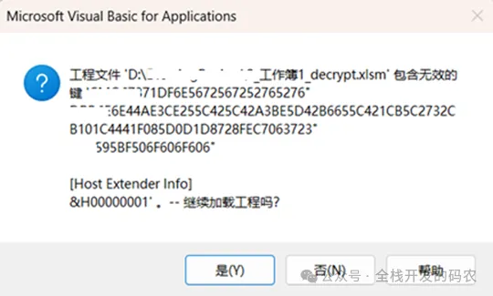 使用时,可将文件拖放到窗体中,也可通过浏览按钮浏览选择文件,当然还可以在上方的文本框里直接输入文件的完整路径和完整文件名,目前支持*.swp、*.xlsm、*.xls、*.xla等4种格式的文件。点击读取文件后,在中间的列表框中会列出VBA程序里所有可见模块、窗体、类模块和不可见模块。点击解除密码,可以解除原文件的VBA代码保护密码,为了不破坏原文件,解除密码后会重新生成一个新文件,新文件名是在原文件名后加上_decrypt,保存在与原文件相同的文件夹下。打开解除密码的文件时,可能会弹出一个警告框,如下图,只需要点击“是”即可。