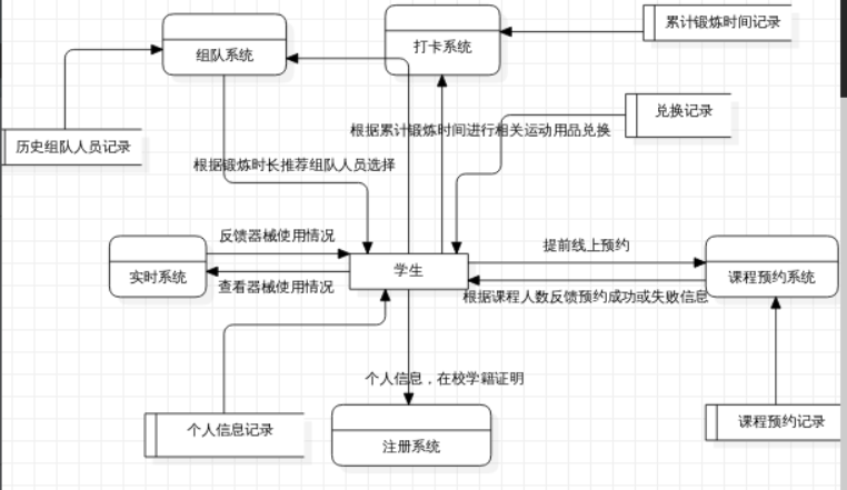 登记学生信息、学生注册、学生提出课程预约、学生提出组队、学生提出打卡兑换、学生查看器械使用情况。