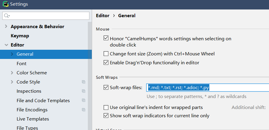 如果想对所有文件都有效,就要在setting里面进行操作:File -> Setting -> Editor -> General -> Use soft wraps in editor。