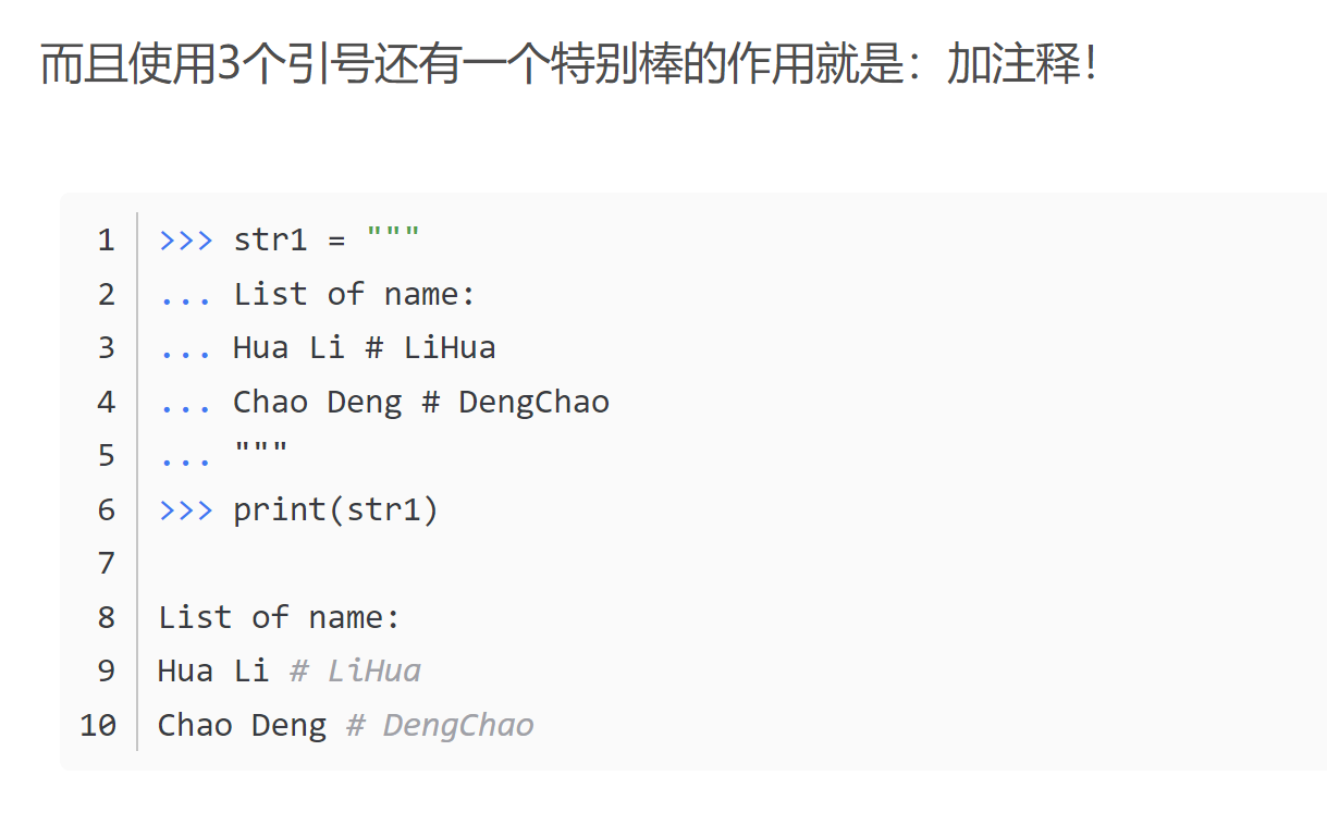 2. python三引号允许一个字符串跨多行,字符串中可以包含换行符、制表符以及其他特殊字符。