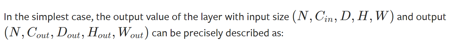 # https://pytorch.org/docs/stable/generated/torch.nn.Conv3d.html import torch import torch.nn as nn input = torch.randn(20, 16, 10, 50, 100) m = nn.Conv3d(16, 33, 3, stride=1) output = m(input) #(20, 33, 10, 50, 100) #20, 33, 4, 24, 49 pass # m = nn.Conv3d(16, 33, (3, 5, 2), stride=(2, 1, 1), padding=(4, 2, 0))