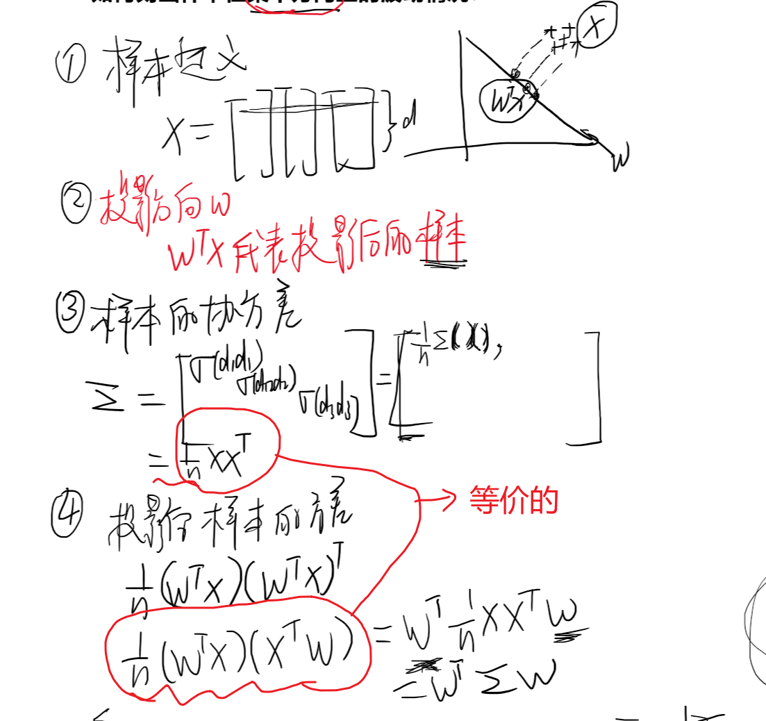 2、如果手上的样本X,经过了线性变换成为Y = wX(可以是直线投影(降维)、缩放(维度不变)、升维度);原始样本的协方差矩阵为∑=1/n(XX^T),变换后的样本协方差为 (w^T)∑w,如何推导,请看下图