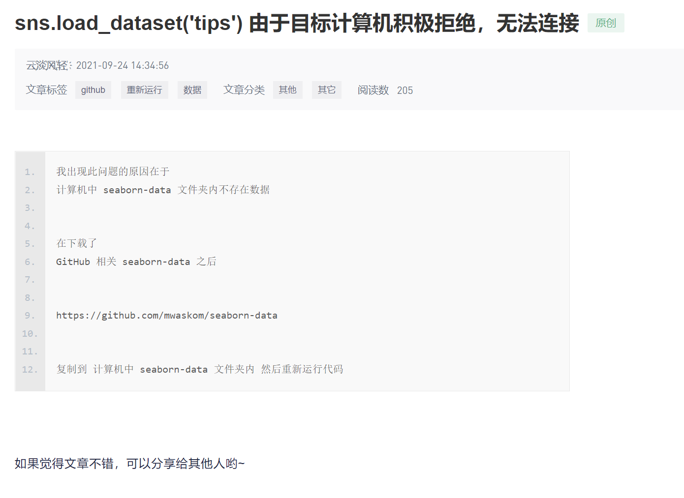 sns.load_dataset('tips') 由于目标计算机积极拒绝,无法连接