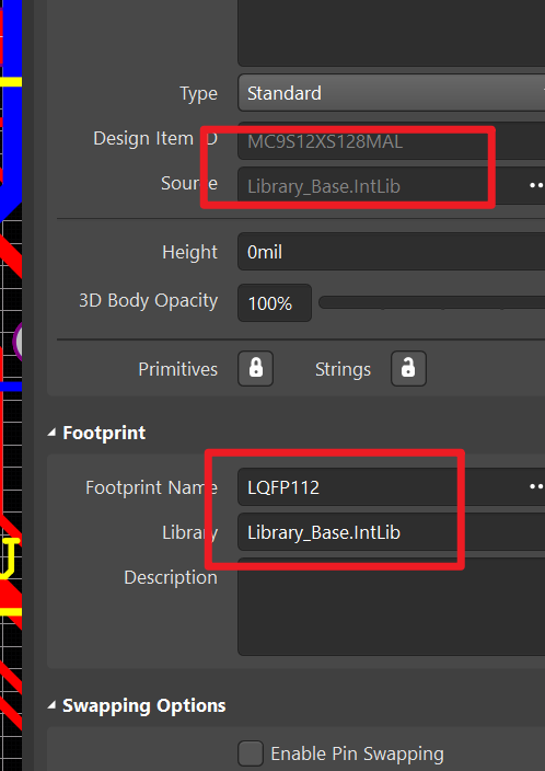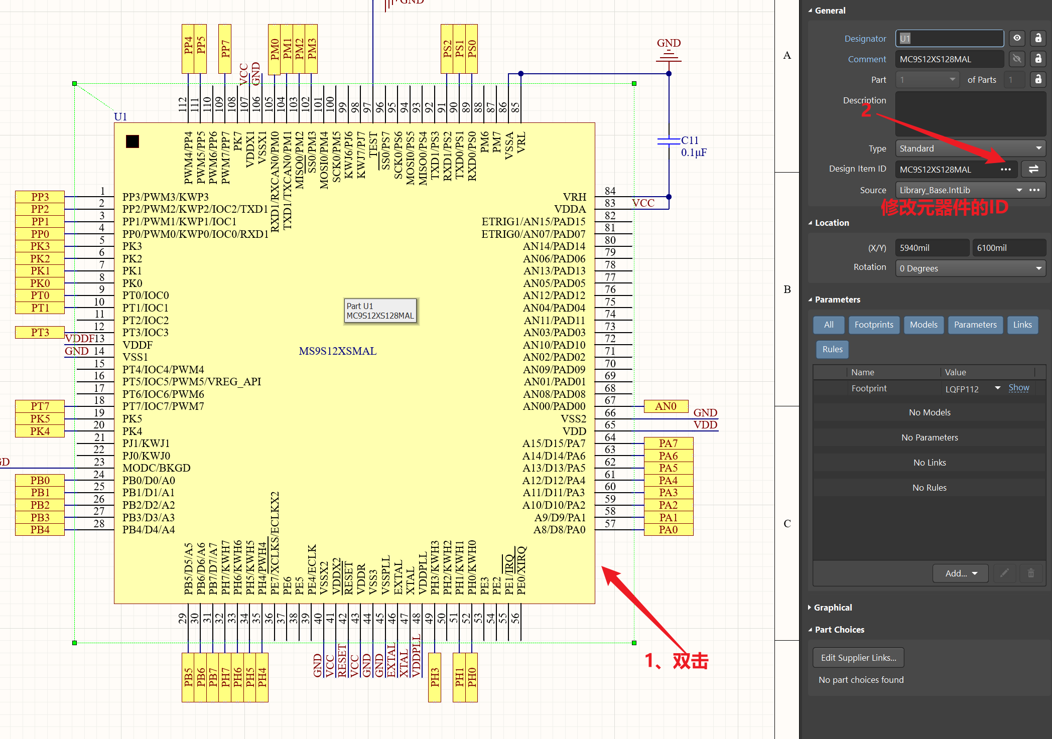 3、在原理图中,修改元器件的ID为 MC9S12XS128MAL (就是 LQFP112)