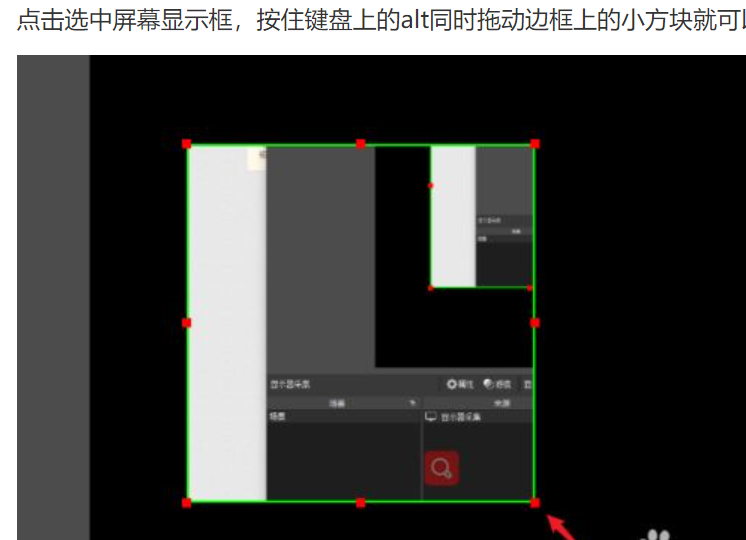 (1)点击选中屏幕显示框,按住键盘上的alt同时拖动边框上的小方块就可以实现区域截取。