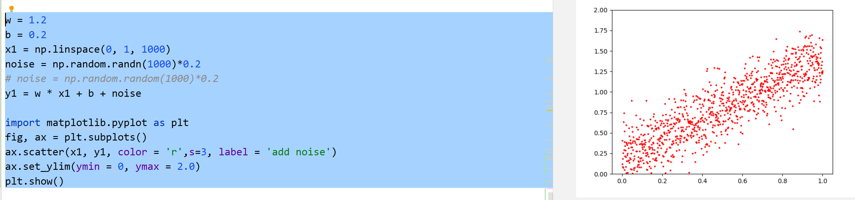 w = 1.2 b = 0.2 x1 = np.linspace(0, 1, 1000) noise = np.random.randn(1000)*0.2 # noise = np.random.random(1000)*0.2 y1 = w * x1 + b + noise import matplotlib.pyplot as plt fig, ax = plt.subplots() ax.scatter(x1, y1, color = 'r',s=3, label = 'add noise') ax.set_ylim(ymin = 0, ymax = 2.0) plt.show()