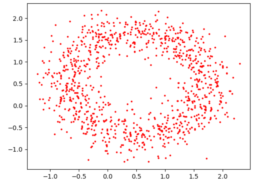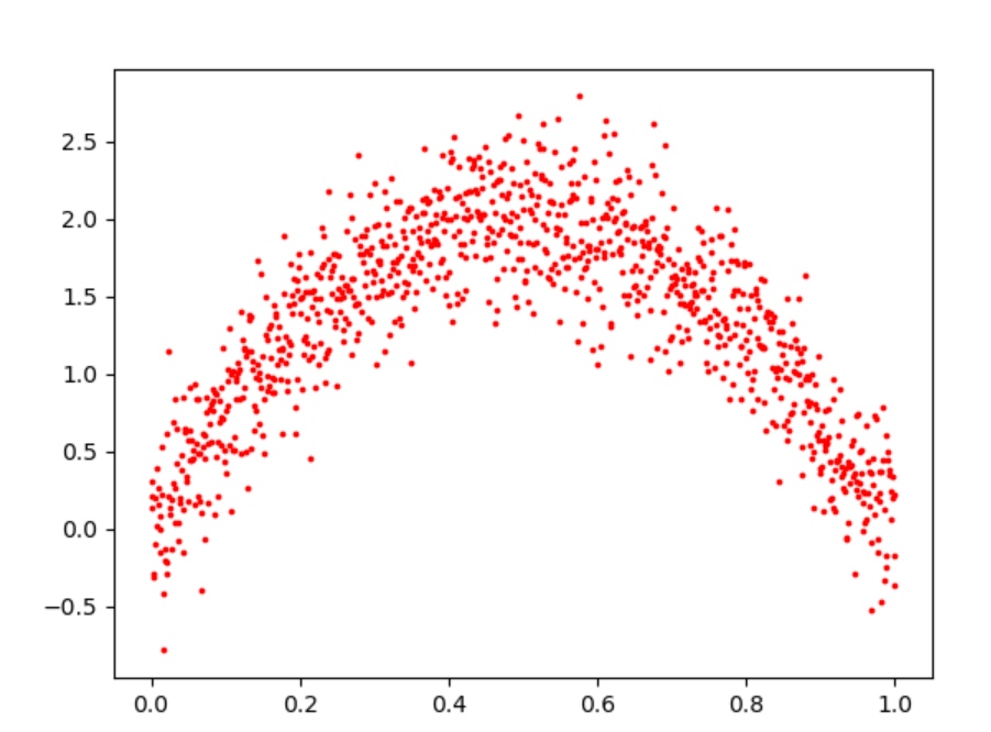 a = -8 b = 8 c = 0 x1 = np.linspace(0, 1, 1000) noise = np.random.randn(1000)*0.3 y1 = a*x1**2 + b*x1 + c + noise import matplotlib.pyplot as plt fig, ax = plt.subplots() ax.scatter(x1, y1, color = 'r',s=3, label = 'add noise') # ax.set_ylim(ymin = 0, ymax = 2.0) plt.show()