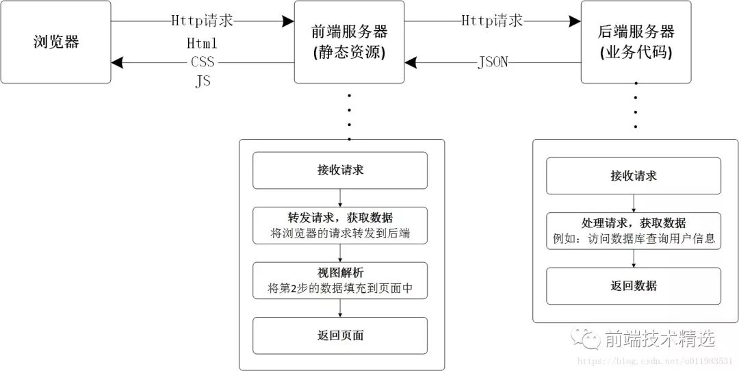 一般公司后端开发人员直接兼顾前端的工作,一边实现API接口,一边开发页面,两者互相切换着做,而且根据不同的url动态拼接页面,这也导致后台的开发压力大大增加。前后端工作分配不均。不仅仅开发效率慢,而且代码难以维护。