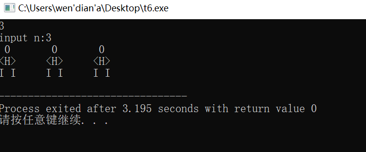 #include<stdio.h> int main() { int n,i; scanf("%d",&n); printf("input n:%d\n",n); for(i=1;i<=n;i++) { printf(" 0 "); printf("\t");} printf("\n"); for(i=1;i<=n;i++) { printf("<H>"); printf("\t"); } printf("\n"); for(i=1;i<=n;i++) { printf("I I"); printf("\t"); } printf("\n"); return 0; }