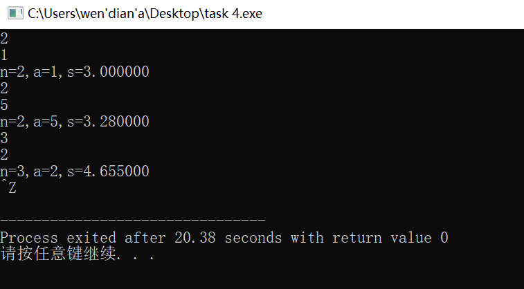 #include<stdio.h> #include<math.h> int main() {int n,a,i,k;double s=0,g=1; while(scanf("%d%d",&n,&a)!=EOF) { for(i=1;i<=n;i++) { g=pow(a,i); s+=(double)i/g; } printf("n=%d,a=%d,s=%lf",n,a,s); } return 0; }